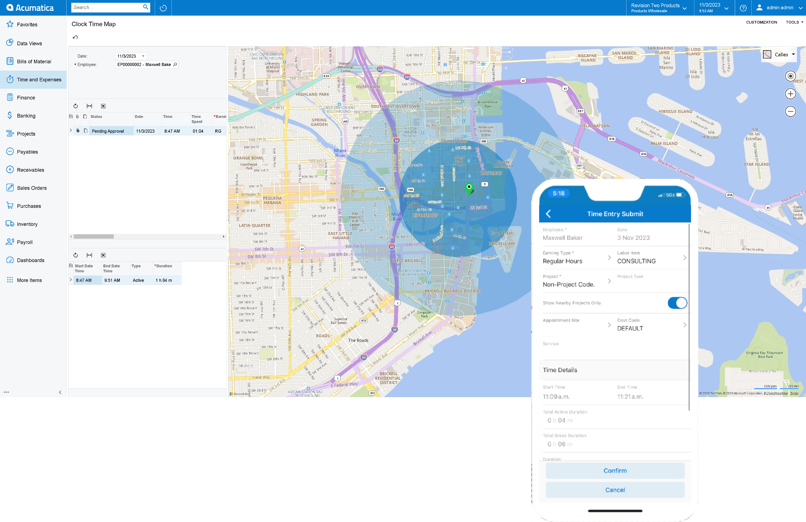Une solution intégrée de manière transparente qui améliore le suivi des heures de travail des employés sur le terrain. Elle offre des fonctionnalités de pointage dans l'application mobile Acumatica, ainsi que des améliorations en matière de suivi et de contrôle, via l'interface web Acumatica. Ces deux composants collaborent pour offrir une expérience améliorée de suivi des temps, en exploitant les capacités des modules Temps et Dépenses d'Acumatica.