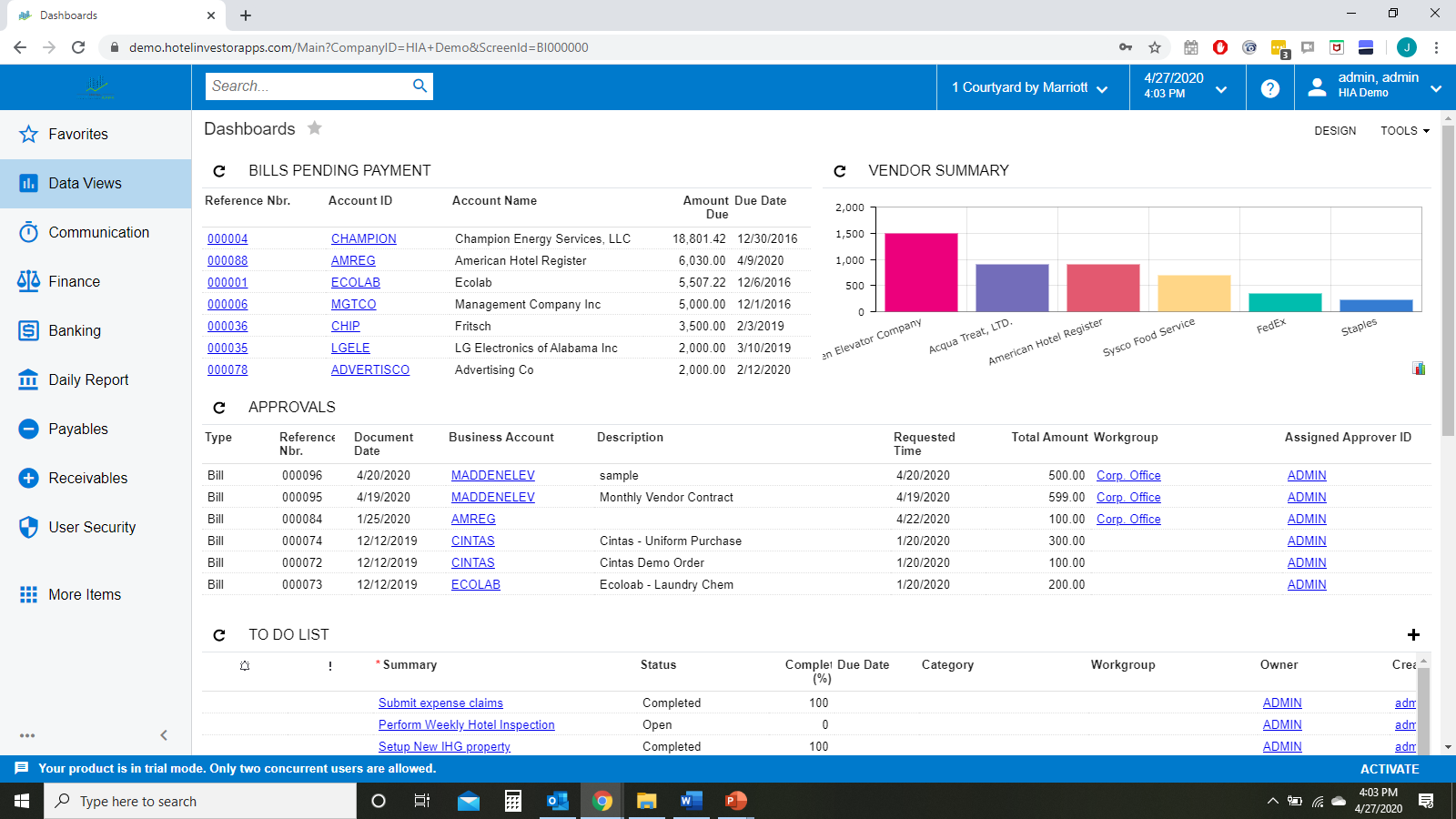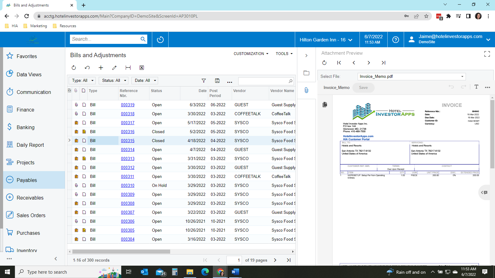 Hotel Investor Apps est le SEUL ERP conçu pour l'industrie hôtelière. Il s'agit d'une solution basée sur le cloud qui répond à la quasi-totalité des besoins comptables des hôtels et des portefeuilles, ainsi que de modules ERP intégrés allant de la business intelligence au CRM et à la gestion des commandes, en plus de solutions logicielles intégrées pour tout le reste, de l'AP automatisée à la paie.