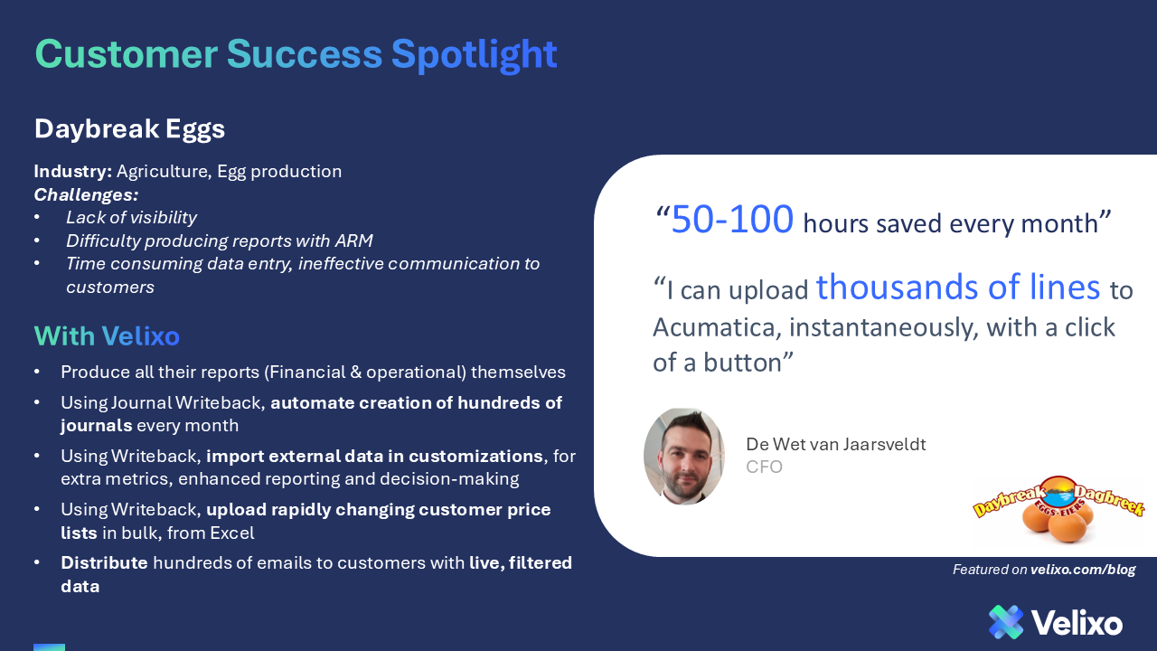 Velixo est mon complément préféré à Acumatica. Les frustrations antérieures du type "Je sais comment faire cela dans Excel, pourquoi ne puis-je pas le faire dans Acumatica" ont disparu. Je l'adore. 5 étoiles !