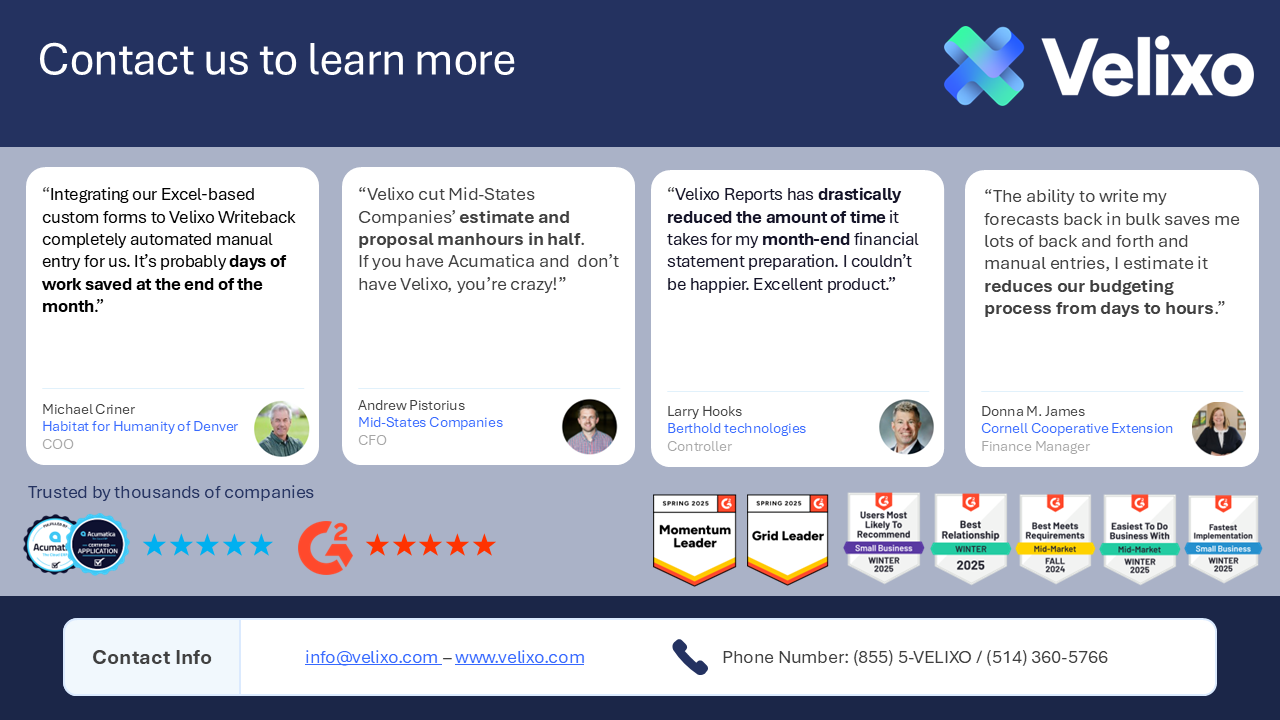 Velixo est un logiciel moderne de reporting, de budgétisation et d'automatisation des données qui s'intègre de manière transparente à Acumatica à partir d'Excel, en temps réel.